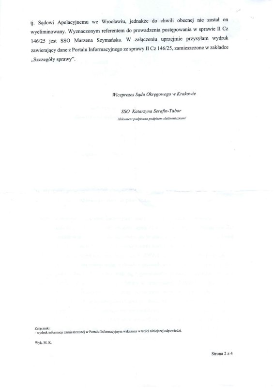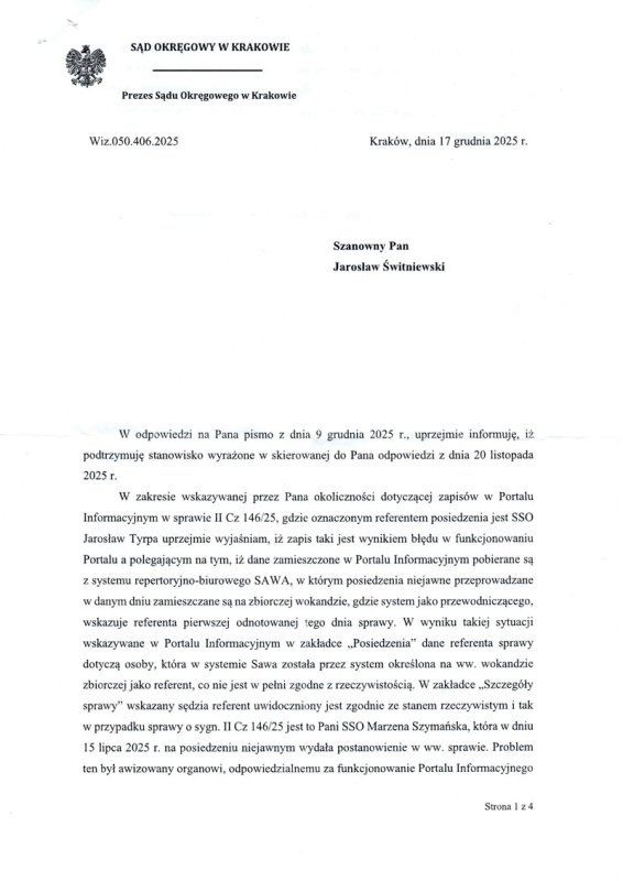 W dniu 17.12.2025 roku Wiceprezes Sądu Okręgowego w Krakowie Katarzyna Serafin-Tabor wysyła do mnie kolejne pismo. Jest to odpowiedź na moje zarzuty. Niestety, ale WYŁĄCZNIE SKUPIŁA SIĘ NA WYJAŚNIENIU PRZYCZYNY WYDANIA DECYZJI PRZEZ INNEGO SĘDZIEGO. Resztę zarzutów zawartych przeze mnie w piśmie JAWNIE ZLEKCEWAŻYŁA. Załączam to pismo. Zapraszam do analizy mojego pisma z dnia 9.12.2025 r. i odpowiedzi Katarzyny Serafin-Tabor – wyraźnie będzie widać, że Wiceprezes Sądu Okręgowego BEZCZELNIE OMINĘŁA NAJWAŻNIEJSZE ZARZUTY.
