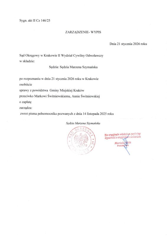 "Przeciwko Panu Markowi Świtniewskiemu i Pani Annie Świtniewskiej 10 grudnia 2021 r. został do Sądu Rejonowego dla Krakowa-Podgórza w Krakowie złożony pozew o zapłatę kwoty 5 039,20 zł tytułem odszkodowania za bezumowane korzystanie z lokalu mieszkalnego (...) położonego przy ul. (...) w Krakowie oraz tytułem opłat niezależnych od właściciela, za orkes od maja 2019 r. do października 2021 r. Nakaz zapłaty sygn. akt I Nc 3959/21/P na kwotę żądaną w pozwie został wydany 21.12.2021 r. Nakaz nie jest prawomocny".