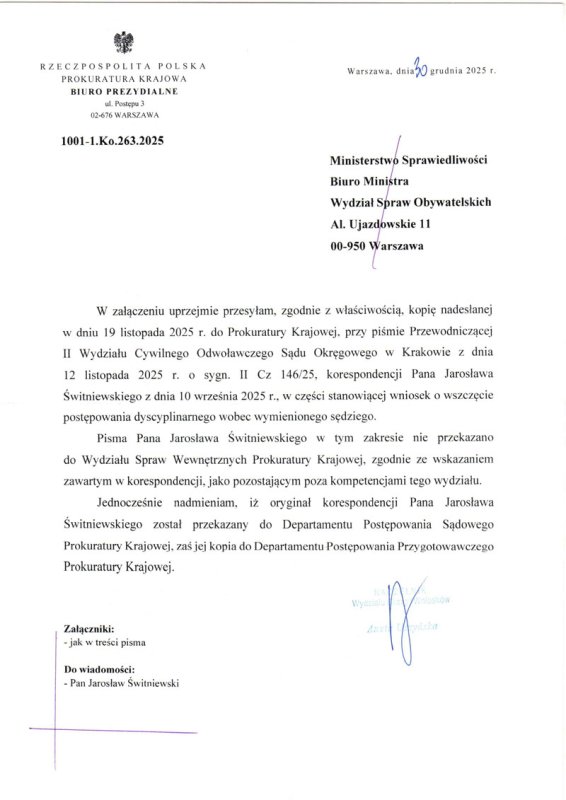 Wobec przesłania przez Sąd informacji do prokuratury w sprawie rozpoczęły się ruchy. Wszystkie dokumenty, które wykażę w tym opisie zamieszczam poniżej. W dniu 1.12.2025 roku Prokuratura Krajowa przesyła pismo do Prokuratury Regionalnej w Krakowie. W dniu 2.12.2025 roku Prokuratura Krajowa przesyła drugą kopię pisma do Prokuratury Okręgowej w Krakowie. W dniu 5.12.2025 r. Prokuratura Regionalna przesyła do Prokuratury Okręgowej w Krakowie 6 Wydział Sądowy. W dniu 12.12.2025 roku Prokuratura Okręgowa przesyła do Prezesa Sądu Okręgowego w Krakowie. W dniu 17.12.2025 r. Prokuratura Okręgowa 6 Wydział Sądowy przesyła do sądu wniosek o akta. AKTA DO 18.01.2026 r. NIE ZOSTAŁY PRZEKAZANE PROKURATURZE. W dniu 30.12.2025 roku Prokuratura Krajowa przesyła zawiadomienie Sądu do Ministra Sprawiedliwości.