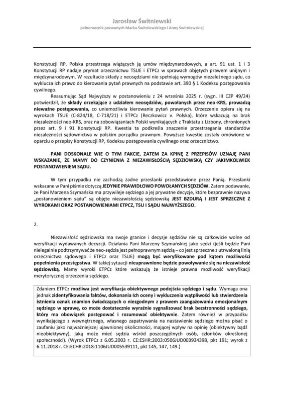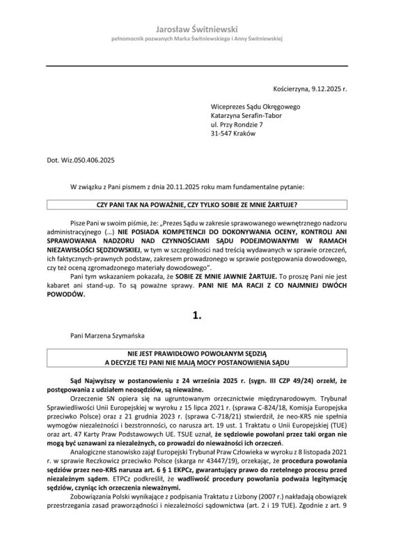 Wobec tak żenującego lekceważenia sytuacji, w dniu 9.12.2025 roku wystosowałem do Pani Wiceprezes Sądu Okręgowego w Krakowie stosowne wyjaśnienia. Przedstawiam je poniżej. Wskazałem, dlaczego twierdzenia Pani Serafin-Tabor są niezgodne z prawem. Wykazałem przede wszystkim podstawę prawną, która mówi, że postanowienie pseudo-sędziego Marzeny Szymańskiej nie istnieje w polskim obrocie prawnym oraz że nawet jeśli postanowienie wydaje legalnie powołany sędzia, to zgodnie z unijnymi wytycznymi i tak jest prawna możliwość weryfikacji postanowienia sędziego. Szczególnie ta weryfikacja jest niezbędna (jak wskazał Europejski Trybunał Praw Człowieka) jeśli zachodzi choć cień podejrzenia, że sędzia jest nieobiektywna. Jak wykazałem wcześniej – neo-sędzia Marzena Szymańska jest nie tylko nieobiektywna, ale wręcz jest narzędziem do zatwierdzania woli urzędników, nawet w przypadku niezgodności z prawem i faktami. PRZYPOMINAM – NEOSĘDZIA MARZENA SZYMAŃSKA ZAKWALIFIKOWAŁA NIEPRAWOMOCNY WYROK (na co dokładnie wskazał Sąd I instancji) JAKO PRAWOMOCNY. Jednostronnie bez możliwości wypowiedzenia się drugiej strony, bez przeprowadzenia stosownego postępowania wyliczyła bliżej nieokreśloną kwotę i od niej kazała moim rodzicom płacić. Bez możliwości ustosunkowania się przez nas do tego wyliczenia. WSZYSTKO ZROBIONO POZA NASZĄ WIEDZĄ I BEZ NASZEGO UDZIAŁU. Ale ważne, że urzędnicy mogą wyłudzić pieniądze tytułem swojej zapłaty za przestępcze poświadczanie nieprawdy oraz składanie fałszywych pozwów.
