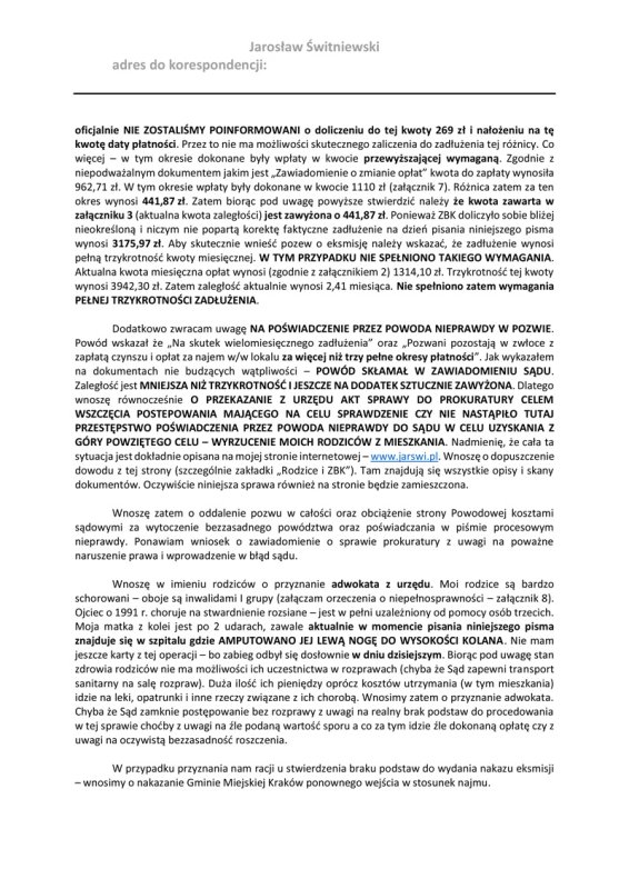 W moim piśmie zarzuciłem składanie przez Radcę Prawnego Michała Seweryna nieprawdziwych informacji i wprowadzenia w błąd sądu. Wniosłem o przekazanie akt sprawy do Prokuratury celem wszczęcia stosownego postępowania karnego. Wbrew twierdzeniom Radcy Prawnego Michała Seweryna zaleglość w momencie składania pozwu nie przekraczała trzykrotności czynszu ani nie wykazywała wielomiesięcznej zaległości. Dowody które zamieściłem w moim piśmie znajdują się już na tej stronie w innych wątkach dlatego ich tutaj nie zamieszczam. Pozew o eksmisję ma rację w momencie przekroczenia w momencie jego składania trzykrotności miesięcznego zobowiązania. Trzykrotność miesięcznego zobowiązania wynosi w tym przypadku 3942,30 zł a tymczasem zaległość zgodnie z dokumetami które są niepodważalne (na wrzesień 2021 r.) wynosi... 3755,54 zł. Od tego należy odliczyć na dzień składania pozwu kwotę 137,70 zł (która to kwota jest związana z faktem iż moi rodzice co miesiąc płacą większą kwotę od wymaganej o 45,90 zł). Od tego należy również odliczyć nielegalnie doliczoną przez ZBK kwotę 441,87 zł. Odejmując te kwoty wychodzi suma zaległości 3175,97 zł zatem wychodzi 2,4 miesiąca NIE JEST TO ZATEM KWOTA KTÓRA KWALIFIKUJE SIĘ DO SKUTECZNEGO ZŁOŻENIA POZWU O EKSMISJĘ, .W swoim piśmie wykazałem, że Gmina Miejska Kraków CELOWO UKRYŁA AKTUALNY STAN ZALEGŁOŚCI. Ukrywając to Radca Prawny Michał Seweryn najprawdopodobniej liczył że uda się wprowadzić w bład Sąd nie tylko pod kątem faktycznej zaległości która nie kwalifikuje się do skutecznego złożenia pozwu o eksmisję. Ma to jeszcze drugie dno. Wykorzystując ten sprytny manewr - podając kwotę zaległości z 2019 roku i ukrywając faktyczną kwotę zadłużenia starano się UKRYĆ ŻE ZADŁUŻENIE MALEJE. Nie ulega wątpliwości że to jest celowe działanie i oczywoiście stanowi przestęsptwo karne. Podejrzewam że Sąd to zbagatelizuje i licząc na bezkarność (niezawisłość sędziowską) sędzia będzie orzekał na korzyść urzędników. Tutaj przypominam, że mam dokument który wskazuje że w przypadku rażącego naruszenia prawa, w tym stronniczości sędzia odpowiada karnie i dyscyplinarnie nawet w przypadku wydanych przez siebie wyroków i postanowień. Niezawisłość sędziowska wbrew powszechniej opinii MA SWOJE GRANICE.