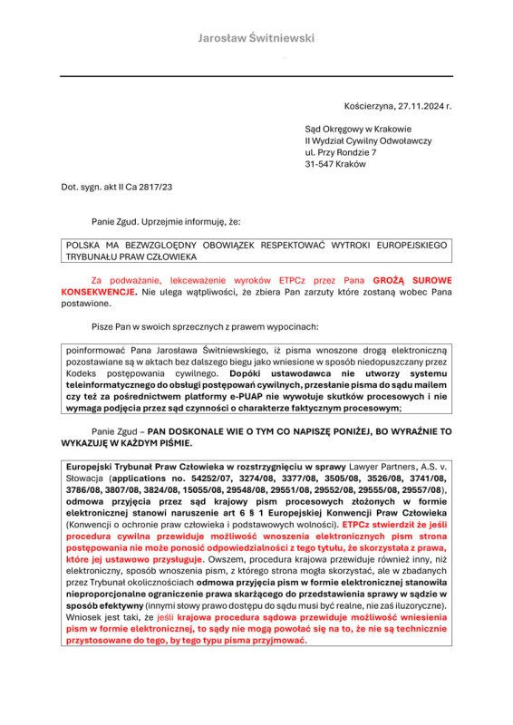 W wyniku tego szokującego działania w dniu 27.02.2023 r. za pośrednictwem platformy EPUAP (data złożenia w sądzie 27.02.2023 godz. 20:34:45.599, identyfikator dokumentu: DOK146017760) wystosowałem pismo podnoszące wszystkie zarzuty dotyczące działania Romana Wilka. Zamieszczam oczywiście poniżej to pismo. Podniosłem wszystkie wcześniejsze zarzuty. Wskazałem na popełnienie przez Romana Wilka kolejnego przestępstwa. Wykazałem że zawiadomienie formalnie nie zostało mi doręczone bo przepisy którymi posługuje się Roman Wilk w oczywisty sposób mnie nie obowiązują. Wskazałem bezpodstawność i nielegalność przeprowadzenia rozprawy w domu moich rodziców. Napisałem że z uwagi na moją nieobecność w Krakowie żądam możliwości zdalnego uczestnictwa w tym nielegalnym zgromadzeniu. Zażądałem wykazania na jakiej podstawie Roman Wilk chce prowadzić rozprawę poza salą sądową - wykazałem brak postanowienia w tej sprawie, brak zgody Prezesa Sądu. Wykazałem że przeprowadzenie tego posiedzenia jest pozbawione sensu bowiem mój ojciec ma problemy z mową a matka ma objawy demencji starczej. Wskazałem że Roman Wilk o tym wiedział ale zlekceważył to. Zarzuty są poważne ale jestem przekonany że sędzia który jawnie kpi sobie z przepisów, procedur i jeszcze wprost się do tego przyznaje (przypominam że mam nagranie z rozprawy na której sędzia sądu cywilnego oznajmia iż "przepisy Kodeksu Cywilnego go nie obowiązują") całkowicie zlekceważy to co piszę. Wszak NAJWAŻNIEJSZE JEST SPEŁNIENIE WOLI URZĘDNIKÓW NAWET JEŚLI JEST TO IRRACJONALNE, NIELEGALNE I POZA WSZELKIMI ZASADAMI NAWET ZDROWEGO ROZSĄDKU.
