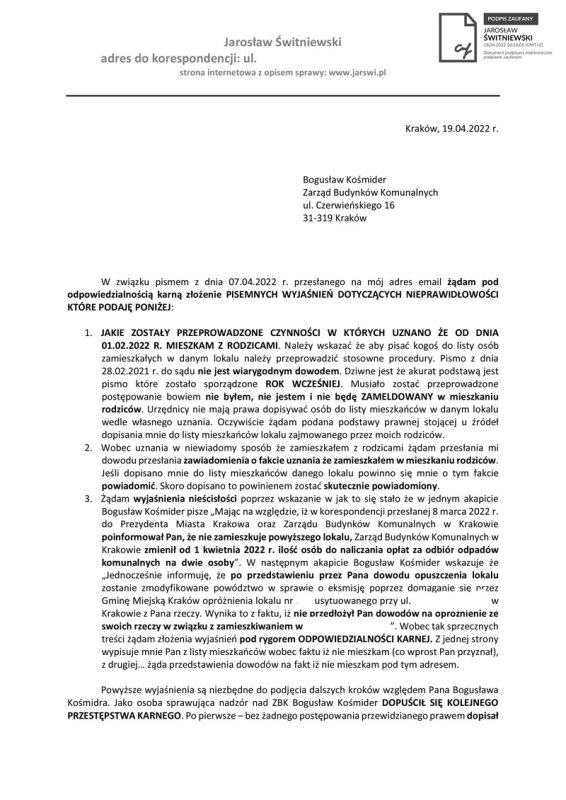 W dniu 07.04.2022 r. Wiceprezydent Miasta Krakowa Bogusław Kośmider wystosował do mnie pismo. Jego treśc wskazuje ewidentnie że Bogusław Kośmider zaczyna się pl,ątać w swoich wskazaniach. Na początek podał że w ziazku z moim pismem do sądu z dnia 28.02.2021 r. (TAK! PISMO WYSŁANE PONAD ROK TEMU) od dnia 01.02.2022 r. zostałem wpisany na listę osób zamieszkujących z moimi rodzicami. W następnym akapicie Bogusłąw Kośmider wskazuje że z uwagi na podanie iż nie mieszkam pod tym adresem od dnia 01.04.2022 r. zmieniono liczbę osób co do których nalicza się dodatkowe opłąty (w domyśle - zostałem wykreślony z listy osób mieszkających z moimi rodzicami). Nie przeszkodziło to aby w następnym akapicie Bogusław Kośmider wskazał że aby moja osoba została wykreślona z pozwu muszę... PRZEDSTAWIĆ DOWÓD ŻE NIE MIESZKAM Z RODZICAMI. Takiej kompromitacji Bopgiusława Kośmidra jeszcze nie widziałem. Sam stwierdził że nie mieszkam z rodzicami ale żeby wycofać mnie z pozwu o eksmisję muszę przedsatwić dowód że nie mieszkam z rodzicami. To jest tak głupie że aż śmieszne. Ponieważ wydaje się to nierealne żeby wiceprezydent naprawdę tak napisał - zamieszczam poniżej skan tego pisma.
