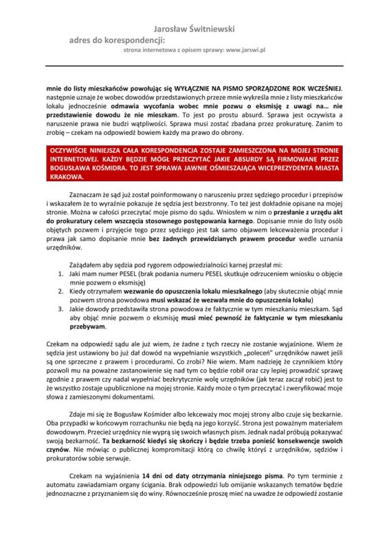 Oczywiście w dniu 19.04.2022 r. wystosowałem pismo do Bogusława Kośmidra w którym wniosłem aby wyjaśnił kilka powaznych problemów. Poprosiłem o wyjaśnienie na jakiej podstawie zostałem dopisany do listy mieszkańców tego lokalu (czyli jakie procedury przewidziane prawem został wykonane). Kiedy dostałwem zawiadomienie o dopisaniu mnie do listy mieszkańców (w końcu każdde postępowanie administracyjne musi zakończyć się stosowną decyzją która powinna do mnie zostać wysłana i na którą mam prawo złożyć zażalenie). Poprosiłem też o wyjaśnienie nrozbieżności pomiedzy stwierdzeniem że nie mieszkam z rodzicami ale Z pozwu mnie nie wypiszą do czasu wskazania że nie mieszkam z rodzicami. Oczywiście wszystko to pod rygorem odpowiedzialności karnej. Wskazałem w piśmie że wszystko jest i będzie zamieszczone na mojej stroniew internetowej.Dałem 14 dni na przedstawienie odpowiedzi. Wykazałem że mam dowody że sąd jest nieobiektywny i jakie sędzia Roman Wilk popełnił nieprawidłowości czym sam się przyznał do celowego działania z pogwałceniem prawa i procedur na rzecz urzędników czym sam naraża się na odpowiedzialność karno-dyscyplinarną (przy okazji zaznaczylem że poinformowałem sędziego o umieszczniu wszelkiej dokumentacji na mojej stronie - sprawa sędziego jest opisana w niniejszym wątku). Moje pismo jest zamieszczone poniżej.