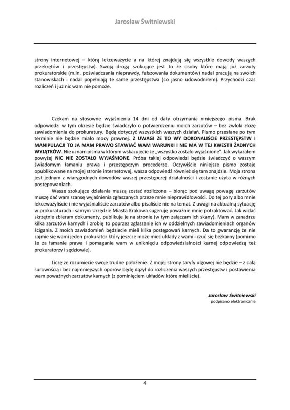 Czekam na odpowiedź Bogusława Kośmidra. Jak tylko ją dostanę natychmiast zamieszczam na stronie. Nadmieniam że co prawda wykreślili mnie z listy osób mieszkających z rodzicami ale NIE ODLICZYLI KWOT NIESŁUSZNIE DOLICZANYCH ZA OKRES OD LUTEGO DO KWIETNIA. Tym samym moi rodzice płacili dodatkowo za mnie za okres w którym nie mieszkałem z nimi. Urzędnicy to potwierdzili ale nie zmniejszyli nalkeżności za nielegalnie dopisaną moją osobę. A na prawdę mają poważny problem bo nie mieszkam w Krakowie a urzędnikom wysłałem niepodważalny dowód na to (wysłałem oficjalny dokument potwierdzający że jestem nawet w innej gminie). Zastanawiające jest zatem jaki dowód mam jeszcze przedstawić i czemu ta zabawa w łamanie prawa i procedur ma służyć. Jak na razie to jest tylko potwierdzenie jawnego lekceważenia przepisów i procedur przez Bogusława Kośmidra. Dokument już jest. Został napisany i podpisany porzez wiceprezydenta. Nie ma możliwości się z niego wycofać a ksekwencje (w tym karne) z treści tego pisma na pewno będą - wcześniej czy później.
