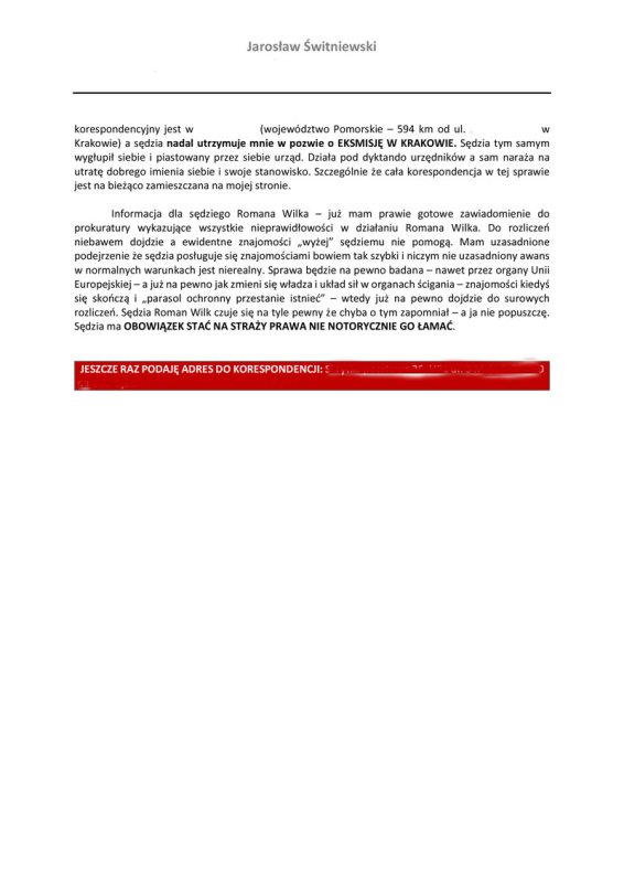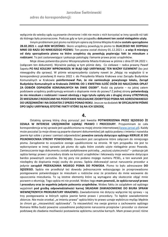 W dniu 30.03.2022 wystosowałem pismo do Sądu (załączam poniżej). W tym dokumencie pokazałem bezspornie że naruszono procedury i prawo przez sędziego Romana Wilka. Wskazałem jakie konsekwencje sędzia może ponieść. Dodatkowo wezwałem sędziego do przedstawienia dowodu potwierdzającego falkt faktycznego zamieszkania mojego w mieszkaniu rodziców jak rówmnież podania mojego numeru PESEL oraz przedstawienia odpisu dostarczonego do mnei wezwania do dobrowolnego opuszczenia mieszkania - wszystko to pod rygorem odpowiedzialności karnej. Skoro sędzia przyjął wniosek urzędników to musiały zostać spełnione wszystkie wymagania które potwierdzają zasadność tego wniosku. Jeśli nie zostały spełnione a sędezia to zlekceważył - potwierdziłdziałanie na korzyść urzędników a to jest dowodem stronniczości co w przypadk usędziego podlega odpwiedzialności karno-dyscyplinarnej. Wskazałem w piśmie że na nieszczęście sędziegho nawet nie mieszkam w Krakowie, przy czym to nie ja muszę ten fakt udawadniać. To sędzia ma udowodnić że posiada wystarczające dowody potwierdzające że faktycznie w tym mieszkaniu przebywam. Jeśli nie ma takich dowodów a wniosek przyjął - dopuścił się przestępstwa karnego. Ja mam dowody niepodważalne że nie mieszkam w tym mieście - alke przedstawięje dopiero prokuraturze w toku postępowania karnego przeciwko sędziemu i urzędnikom.