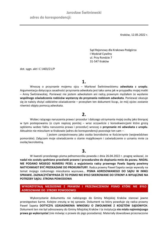W dniu 23.04.2022 r. sędzia Roman Wilk w odpowiedzi na moje wcześniejsze pismo wydał zarządzenie w którym... KAZAŁ PRZESŁAĆ MOJE WEZWANIE DO ZŁOŻENIA PRZEZ SĘDZIEGO WYJAŚNIEŃ DO PEŁNOMOCNIKA URZĘDU MIASTA KRAKOWA. Szokujące i jawne potwierdzenie całkowitej zależności decyzji sędziego od wskazań urzędników. To działanie poparte dokumentami jasno pokazuje że sędzia jest wpełni zależny od urzędników naruszając przy tym najświętszą i najważniejszą zasadę - BEZSTRONNOŚCI. Sędzia chyba myślał że ten dokument pozostanie ukryty. Jednak znajduje się ws Portalu Informacyjnym Sądów Powszechnych do którego mam pełny i legalny dostęp. Równocześnie w dniu 26.04.2022 r. radca prawny Paweł Sapeta wysyła do sądu "pismo przygotowawcze powoda". W piśmie tym oprócz powtórzenia wcześniejszych twierdzeń nadal nie podano mojego numeru PESEL (co jest wymogiem NIEZBĘDNYM do dopisania mnie do pozwu). Wskazano natomiast że ponoć ja sam oświadczyłem że zamieszkuję wraz z rodzicami. Dowodem na to miały być pisma procesowe w innym postępowaniu. Radca prawny Paweł Sapeta NIESTETY WPROWADZAJĄC W BŁĄD SĄD UKRYŁ NIEZBĘDNE ELEMENTY KTÓRE MOŻNA PRZECZYTAĆ W TYM WĄKU A BYŁ OPISANE W PIŚMIE WICEPREZYDENTA (sprawa opisana jest powyżej). Jakoś pan Sapeta "zapomniał" podać że pismo do sądu w innej saprawie na które się powołuje zostało sporządzone ROK WCZEŚNIEJ a dokładnie 28.02.2021 r. a pozew o eksmisję został złożony w 01.12.2021 r. Radca prawny Paweł Sapeta ukrył to celowo - musiałby się tłumaczyć dlaczego wobec powołania się na pismo wystawione 8 miesięcy przed złożeniem pozwu o eksmiję nie zostałem ujęty w tym pozwie od razu tylko w toku postępowania (i to w momencie w którym zostałem pełnomocnikiem rodziców). Aby uniknąć tego zarzutu po prostu przemilczał sprawę któa ważna w tym przypadku. Nasuwa się oczywiste podejrzenie - mamy tutaj kolejny w tym postępowaniu przypadek wprowadzenia w błąd sąd. Czy sędzia któremu zgłosilem te nieprawidłowości zadziała zgodnie z procedurami i zgłosi sprawę do prokuratury? Oczywiście że nie - w końcu ma za zadanie służyć urzędnikom nawet z pogwałceniem prawa (treści dokumentów jasno uwiarygadniają ten zarzut - moje wnioski są całkowicie ignorowane a wnioski urzędników nawet zawierające elemnetarne braki formalne zamiast zostać odrzucone są przyjęte bez mrugnięcia okiem - to wynika wprost z dokumenbtów które są poniżej). Oba wskazane dokumenty - zarządzenie sędziego i pismo radcy prawnego Pawła Sapety zamieszczam poniżej.