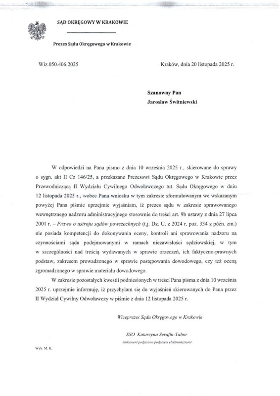 W dniu 20.11.2025 roku pisze do mnie Wiceprezes Sądu Okręgowego w Krakowie Katarzyna Serafin-Tabor (załączam to pismo poniżej). Pani ta w swoim tekście jawnie chroni osoby, która nielegalnie podaje się za sędziego. Pomimo swojej wiedzy, że w świetle prawa orzeczenia wydane przez niewłaściwie powołane osoby nie mają mocy wiążącej a sędziowie tacy nie są sądem w rozumieniu polskich przepisów. Jednak nie przeszkadza jej, aby powołać się na „NIEZAWISŁOŚĆ SĘDZIOWSKĄ”.