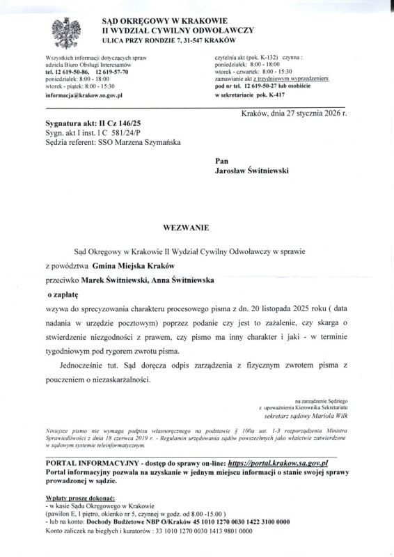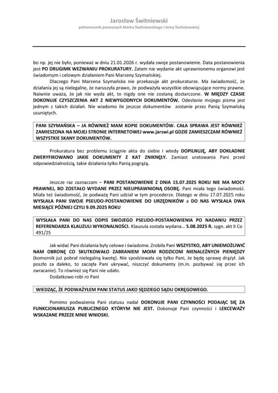 Następuje eskalacja dziwnych działań. W dniu 27.01.2026 r. pseudo-sędzia Marzena Szymańska wystawiła wezwanie do sprecyzowania mojego pisma z dnia 20.11.2025 roku (załączam to wezwanie). W tym dokumencie wskazała jeszcze, że doręcza odpis zarządzenia z fizycznym zwrotem pisma z pouczeniem o niezaskarżalności. Faktycznie takie kompletnie bezprawne zarządzenie zostało wydane w dniu 21.01.2026 roku (załączam ten dokument).