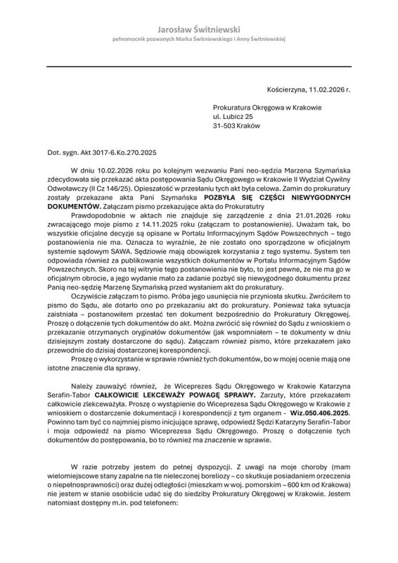 Z tego powodu w dniu 11.02.2026 r. przesyłam bezpośrednio do prokuratury brakującą dokumentację. W piśmie przewodnim do prokuratury (załączam go poniżej) opisuję całą sprawę. Wskazuję, że celowo Pani Marzena Szymańska lekceważyła wcześniejsze wezwania prokuratury do przesłania akt – chciała usunąć niewygodne dokumenty i tym samym zapewnić sobie bezkarność. Wskazałem również, żeby prokuratura objęła swoich działaniem postepowanie Wiceprezes Sądu Okręgowego w Krakowie Katarzynę Serafin-Tabor, która lekceważy nieprawidłowości. Wskazałem na jej korespondencję ze mną (podałem stosowną sygnaturę). Pokazałem, że sędziowie mimo obowiązku nie zawiadomili z urzędu organów ścigania o popełnieniu przez urzędników przestępstwa składania fałszywych pozwów. Jeszcze raz opisałem istotę nieprawidłowości.