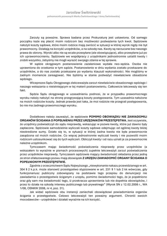 Na koniec zażądałem, aby sprawa została przekazana do Prezesa Sądu Okręgowego, Rzecznika Dyscyplinarnego oraz Biura Spraw Wewnętrznych Prokuratury Krajowej. Wskazałem, że mam świadomość obrony sędziów przed odpowiedzialnością, dlatego wszystko będzie publikowane na stronie, a każdy kto naruszy prawo będzie zgłaszany do stosownych służb.