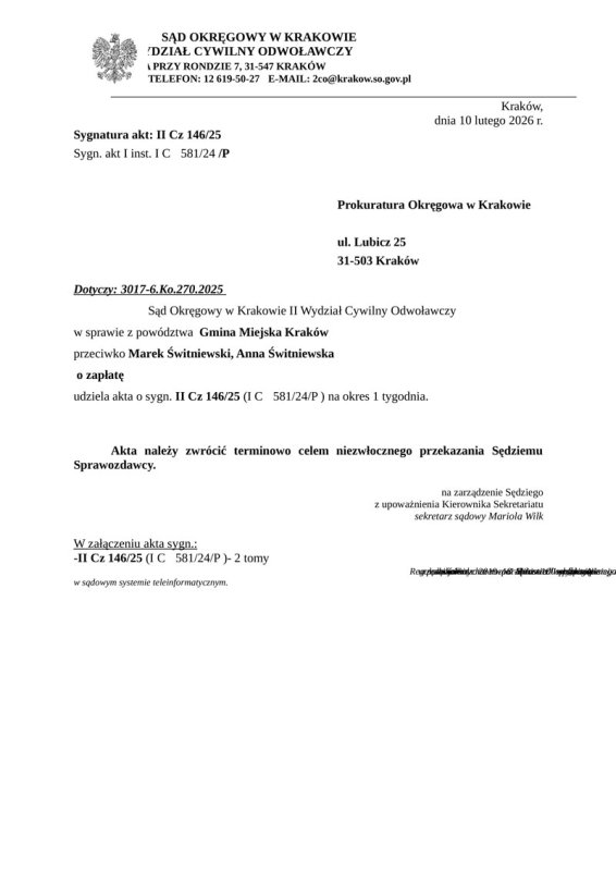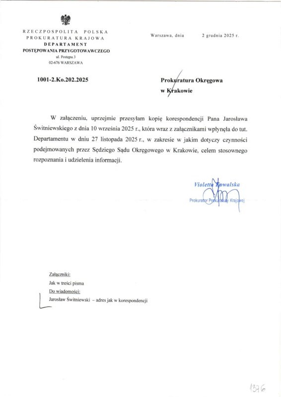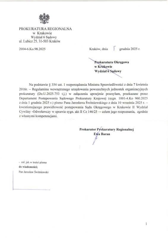 Wobec przesłania przez Sąd informacji do prokuratury w sprawie rozpoczęły się ruchy. Wszystkie dokumenty, które wykażę w tym opisie zamieszczam poniżej. W dniu 1.12.2025 roku Prokuratura Krajowa przesyła pismo do Prokuratury Regionalnej w Krakowie. W dniu 2.12.2025 roku Prokuratura Krajowa przesyła drugą kopię pisma do Prokuratury Okręgowej w Krakowie. W dniu 5.12.2025 r. Prokuratura Regionalna przesyła do Prokuratury Okręgowej w Krakowie 6 Wydział Sądowy. W dniu 12.12.2025 roku Prokuratura Okręgowa przesyła do Prezesa Sądu Okręgowego w Krakowie. W dniu 17.12.2025 r. Prokuratura Okręgowa 6 Wydział Sądowy przesyła do sądu wniosek o akta. AKTA DO 18.01.2026 r. NIE ZOSTAŁY PRZEKAZANE PROKURATURZE. W dniu 30.12.2025 roku Prokuratura Krajowa przesyła zawiadomienie Sądu do Ministra Sprawiedliwości.