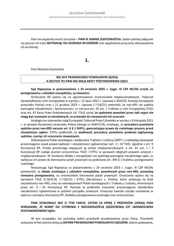 W dniu 23.10.2025 roku wysyłam odpowiedź do neosędzi Sądu Okręgowego Sędzi Sądu Rejonowego Marzeny Szymańskiej na jej wezwanie (załączam to pismo poniżej). W piśmie tym po pierwsze wskazałem że wnoszę o sporządzenie uzasadnienia bezprawnej decyzji neosędzi. Po drugie - załączyłem potwierdzenie przelewu żądanej kwoty. W piśmie przypomniałem o CAŁKOWITYM ZLEKCEWAŻENIU PRZEZ MARZENĘ SZYMAŃSKĄ ZGŁOSZONYCH PRZEZE MNIE W POPRZEDNIEJ KORESPONDENCJI WNIOSKÓW. Wyszczególniłem wszystkie zarzuty (ponownie) i zgłosiłem nowe. Na koniec podałem dowody, że działania takich osób jak neo-sędzia Marzena Szymańska zostanie dokładnie rozliczone i będą stawiane za jawne łamanie prawa i działania na korzyść jednej ze stron zarzuty karne i dyscyplinarne. Jak tylko otrzymam pseudo-uzasadnienie pseudo-postanowienia neosędziego Sądu Rejonowego SSR (Sędziego Sądu Rejonowego) Marzeny Szymańskiej, to natychmiast go zamieszczę na stronie.